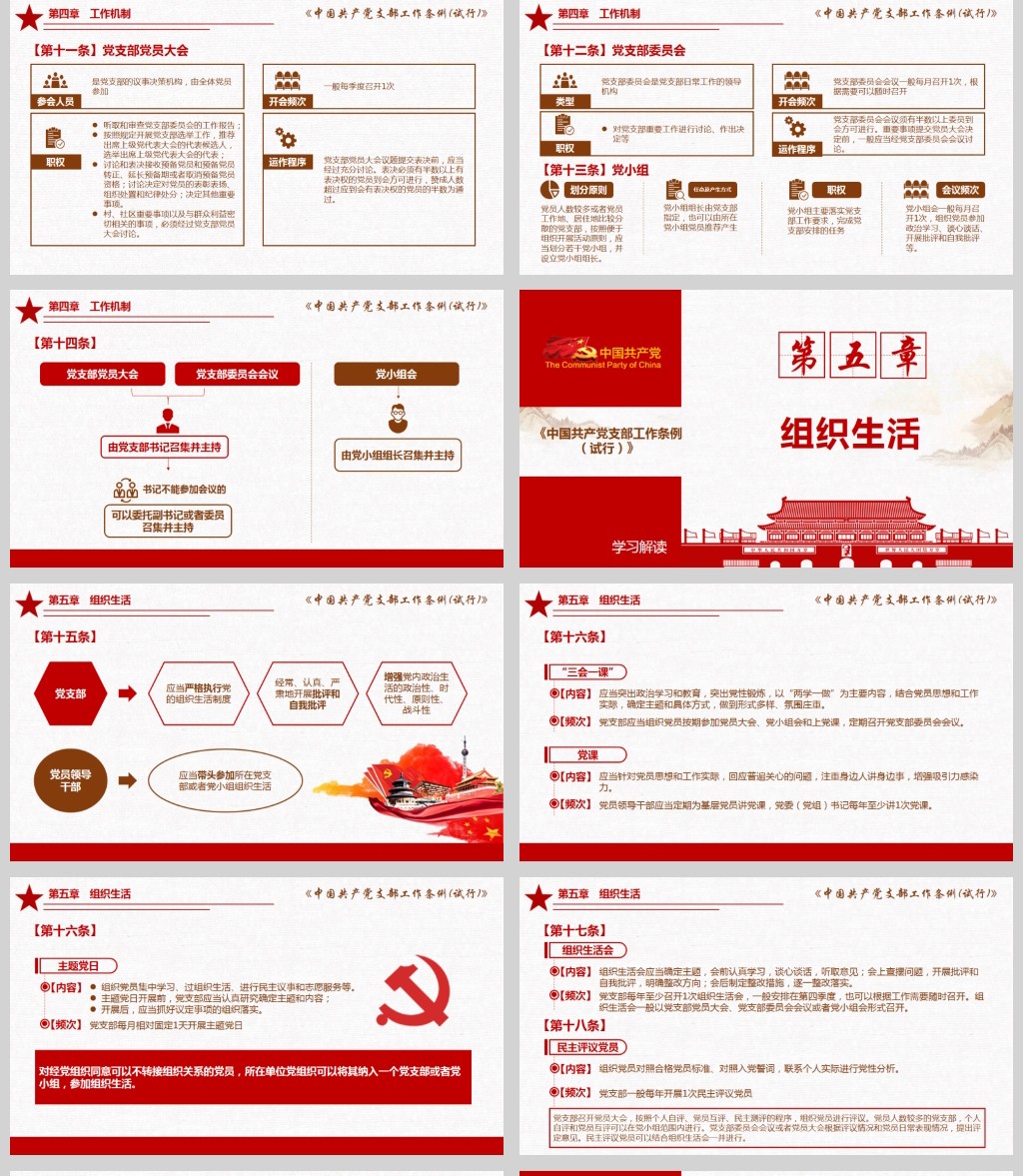 【注意】学习解读中国共产党支部工作条例(试行)党课PPT模板含讲稿,其他内容仅为参考,在正式场合使用请先认真校稿,避免造成不必要的麻烦及损失,网页预览图展示部分是作品的实景效果图,此效果图仅供参考,具体作品以下载后的源文件为准,另外作品授权不包含作品中使用到的字体和摄影图,下载作品后请自行替换。