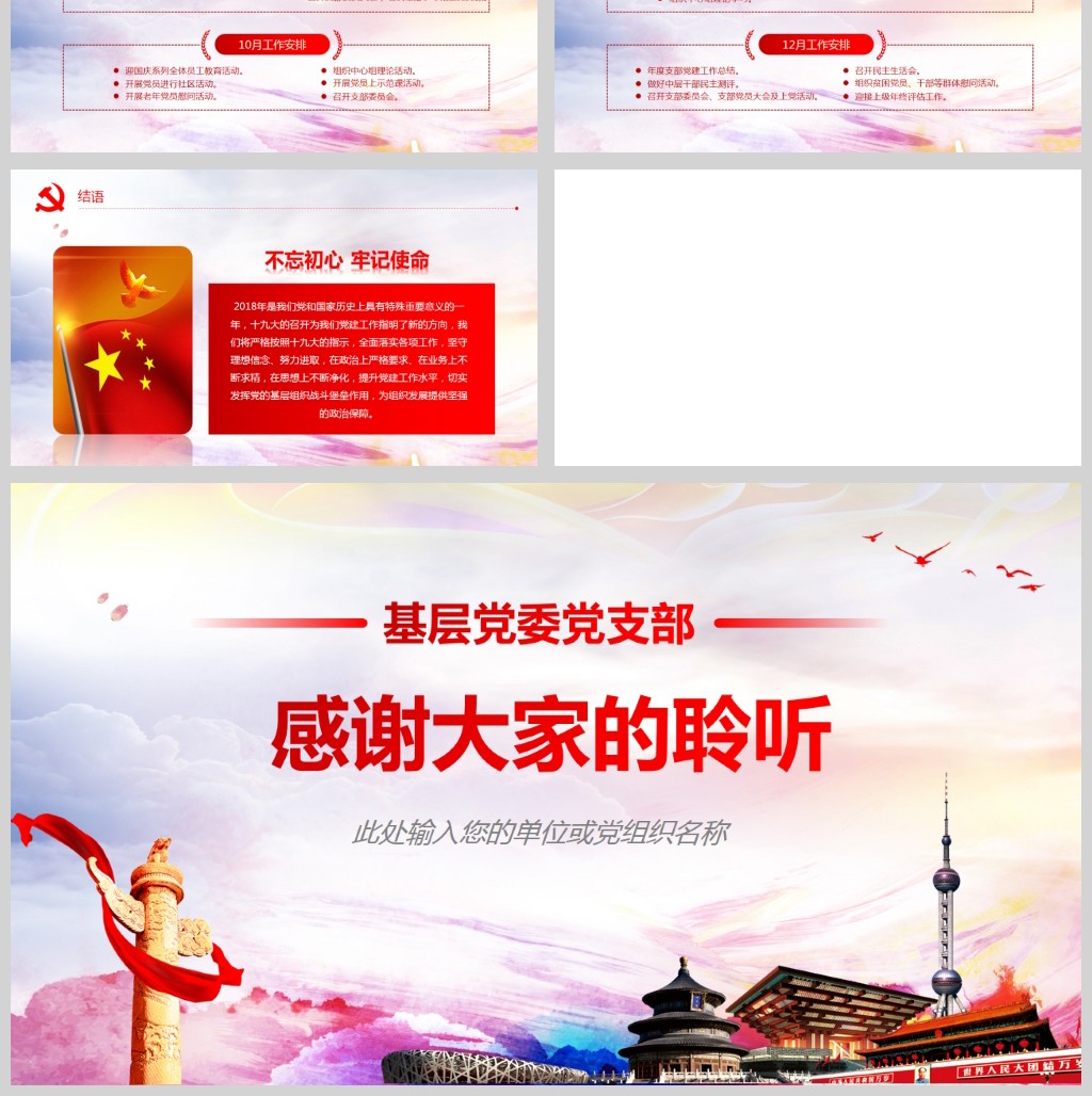 【注意】基层党委党支部2019年度党建工作计划下载其他内容仅为参考,在正式场合使用请先认真校稿,避免造成不必要的麻烦及损失,网页预览图展示部分是作品的实景效果图,此效果图仅供参考,具体作品以下载后的源文件为准,另外作品授权不包含作品中使用到的字体和摄影图,下载作品后请自行替换。