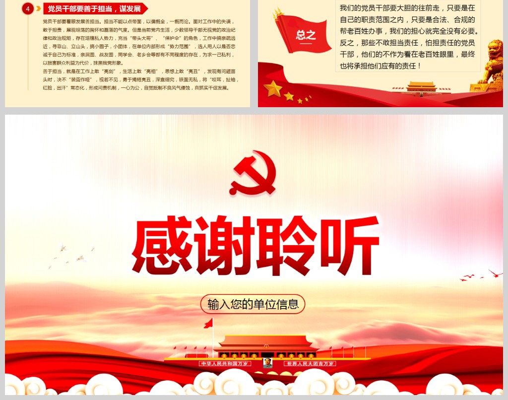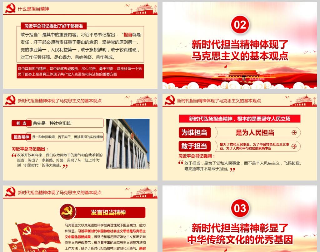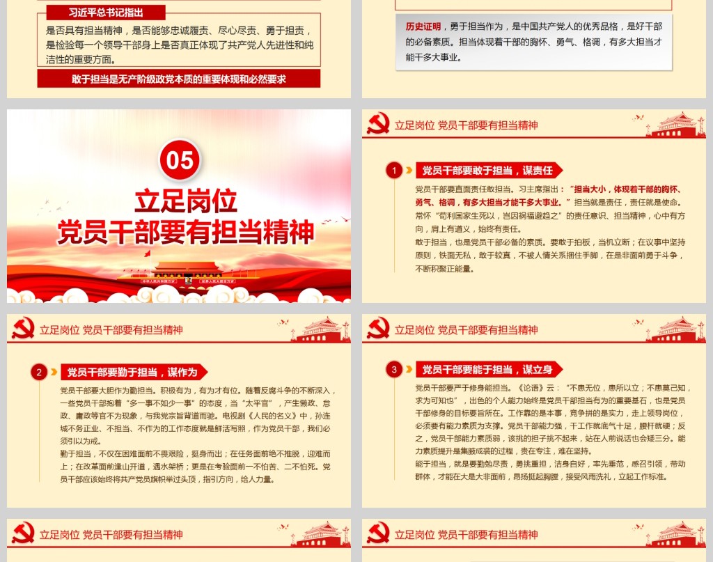 【注意】发扬担当精神党员干部应该担当起该担当的责任微党课PPT模板含讲稿下载其他内容仅为参考,在正式场合使用请先认真校稿,避免造成不必要的麻烦及损失,网页预览图展示部分是作品的实景效果图,此效果图仅供参考,具体作品以下载后的源文件为准,另外作品授权不包含作品中使用到的字体和摄影图,下载作品后请自行替换。