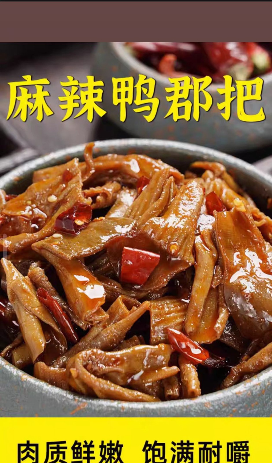 麻辣鸭郡是一种源自四川的特色小吃,通常指用鸭胗(鸭胃)或鸭郡把(鸭食管)等部位制作的麻辣风味卤味或串串食材,以其麻辣鲜香、口感脆嫩而受欢迎,常作为休闲零食、下酒菜或火锅配菜。